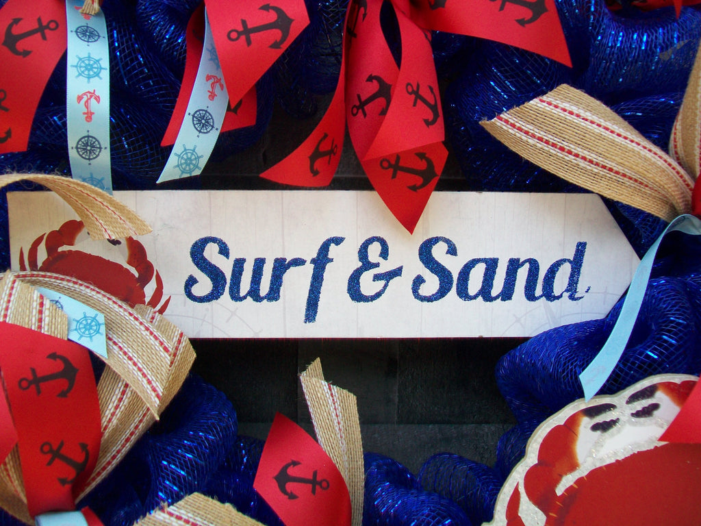 You don't have to live on the beach to showcase this nautical themed wreath on your front door, wall or over the mantle. It is made on a circular wire rim and is covered with red mesh. The wreath is filled with nautical themed ribbon and at the center is a wood plaque that reads "Surf & Sand".
